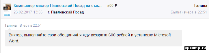 Но, к сожалению работа есть работа. Ну что - одни ушли, пришли другие. На Авито нашел объявление "Компьютерный мастер Павловский Посад на выезде" зовут его Виктор, подумал как и все, с нашего города, надо "вызывать". Но все равно начал пробивать, интересно же, кто такой, откуда и тут посыпалось: У меня ноутбук и вроде как начал тормозить (конечно такого не может быть, я сам занимаюсь ремонтом :-)), Виктор в начале разговора объяснил: проблема может быть либо в жестком диске, либо в операционной системе. На мой вопрос про вирусы, он бы посоветовал переустановить систему, НО при удалении вирусов будет все равно тормозить, потому как при перезагрузке (не переустановке ОС) у меня останется какой-то файл вирусный файл, как так Виктор? Вы же удалите вирусы и должно быть все в порядке, обычно услуга так и называется "Удаление вирусов" что и подразумевает, удалить вирусы в системе, а не по ушам ездить! Разводить клиентов. Вот собственно и сам разговор:
