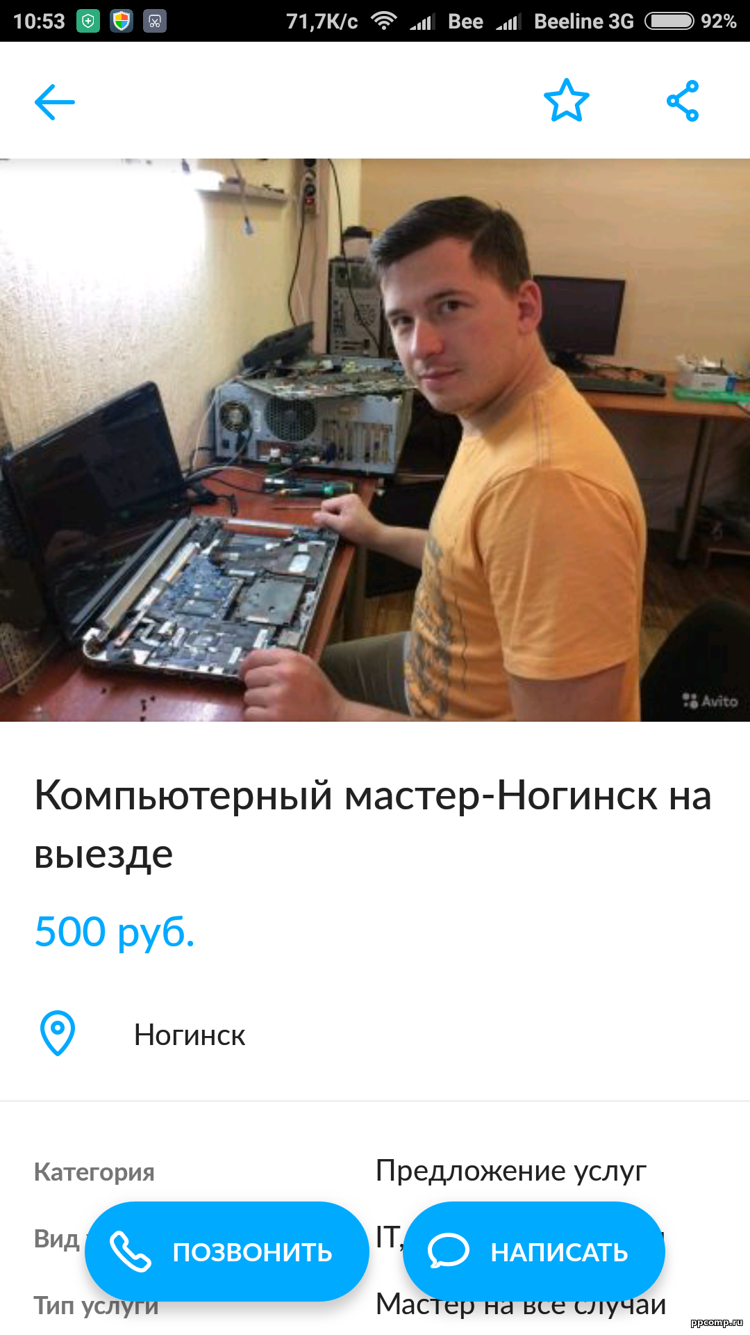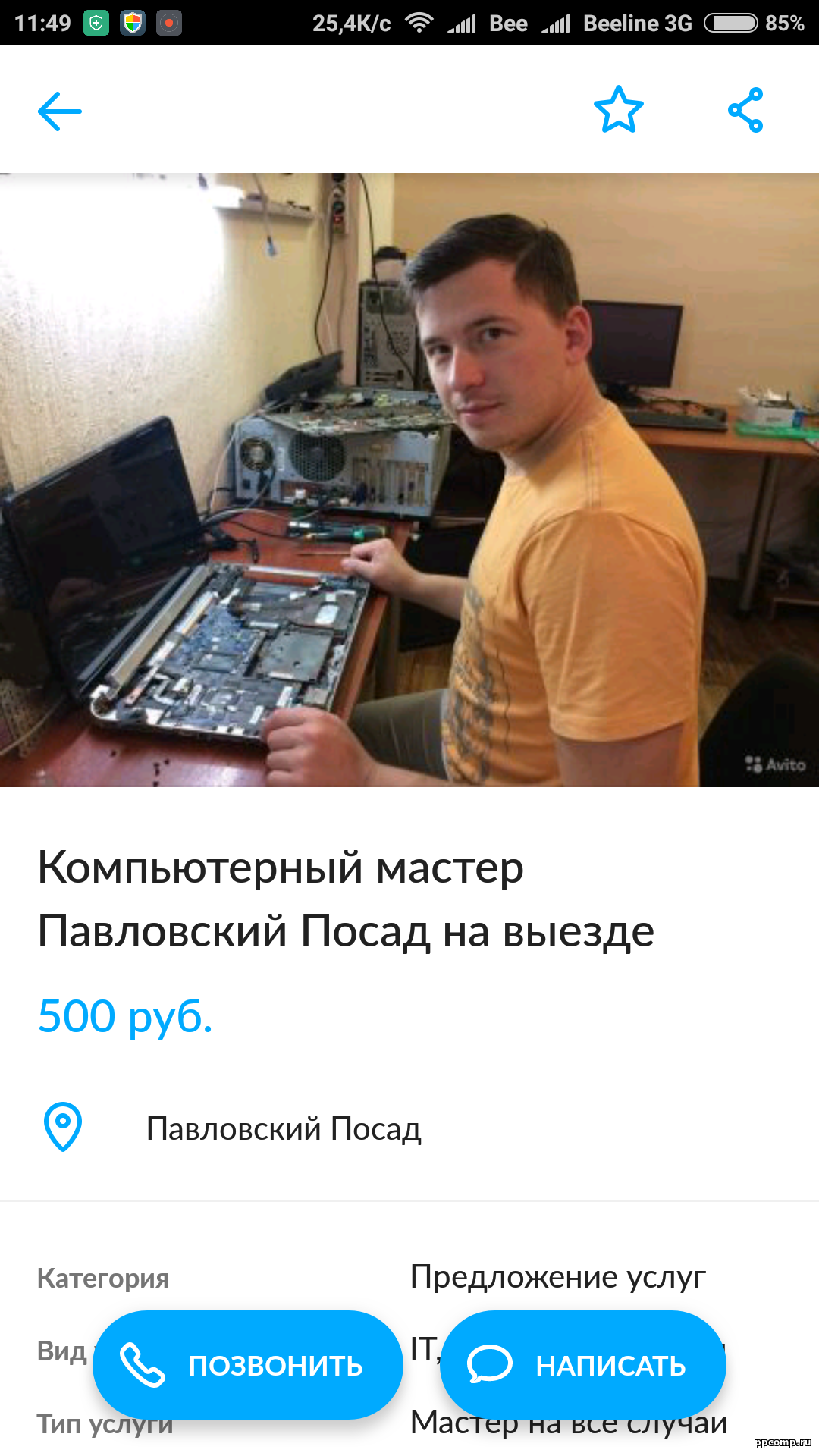 Но, к сожалению работа есть работа. Ну что - одни ушли, пришли другие. На Авито нашел объявление "Компьютерный мастер Павловский Посад на выезде" зовут его Виктор, подумал как и все, с нашего города, надо "вызывать". Но все равно начал пробивать, интересно же, кто такой, откуда и тут посыпалось: У меня ноутбук и вроде как начал тормозить (конечно такого не может быть, я сам занимаюсь ремонтом :-)), Виктор в начале разговора объяснил: проблема может быть либо в жестком диске, либо в операционной системе. На мой вопрос про вирусы, он бы посоветовал переустановить систему, НО при удалении вирусов будет все равно тормозить, потому как при перезагрузке (не переустановке ОС) у меня останется какой-то файл вирусный файл, как так Виктор? Вы же удалите вирусы и должно быть все в порядке, обычно услуга так и называется "Удаление вирусов" что и подразумевает, удалить вирусы в системе, а не по ушам ездить! Разводить клиентов. Вот собственно и сам разговор: